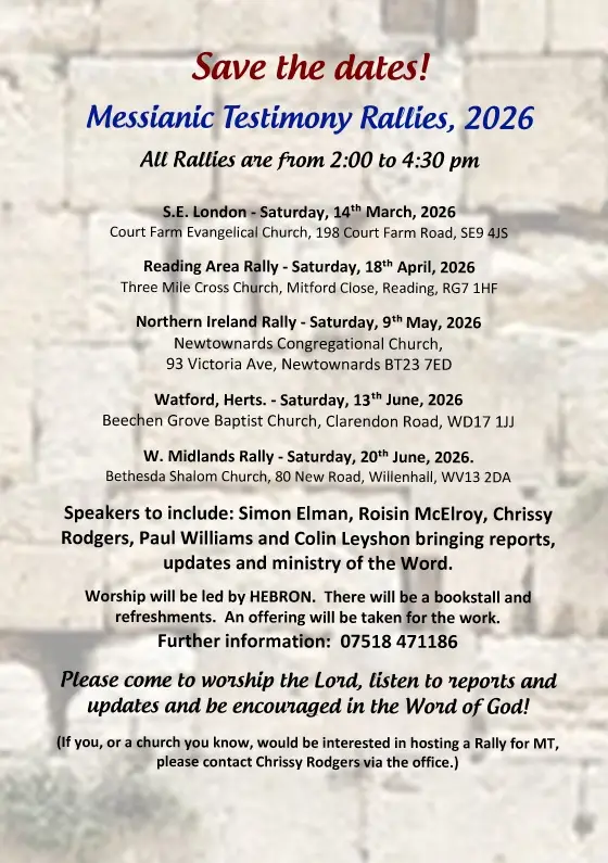 Messianic Testimony was constituted in 1977 with the merger of the Mildmay Mission to the Jews, founded by John Wilkinson in 1876, and the Hebrew Christian Testimony to Israel, founded by David Baron and C A Schönberger in 1893.